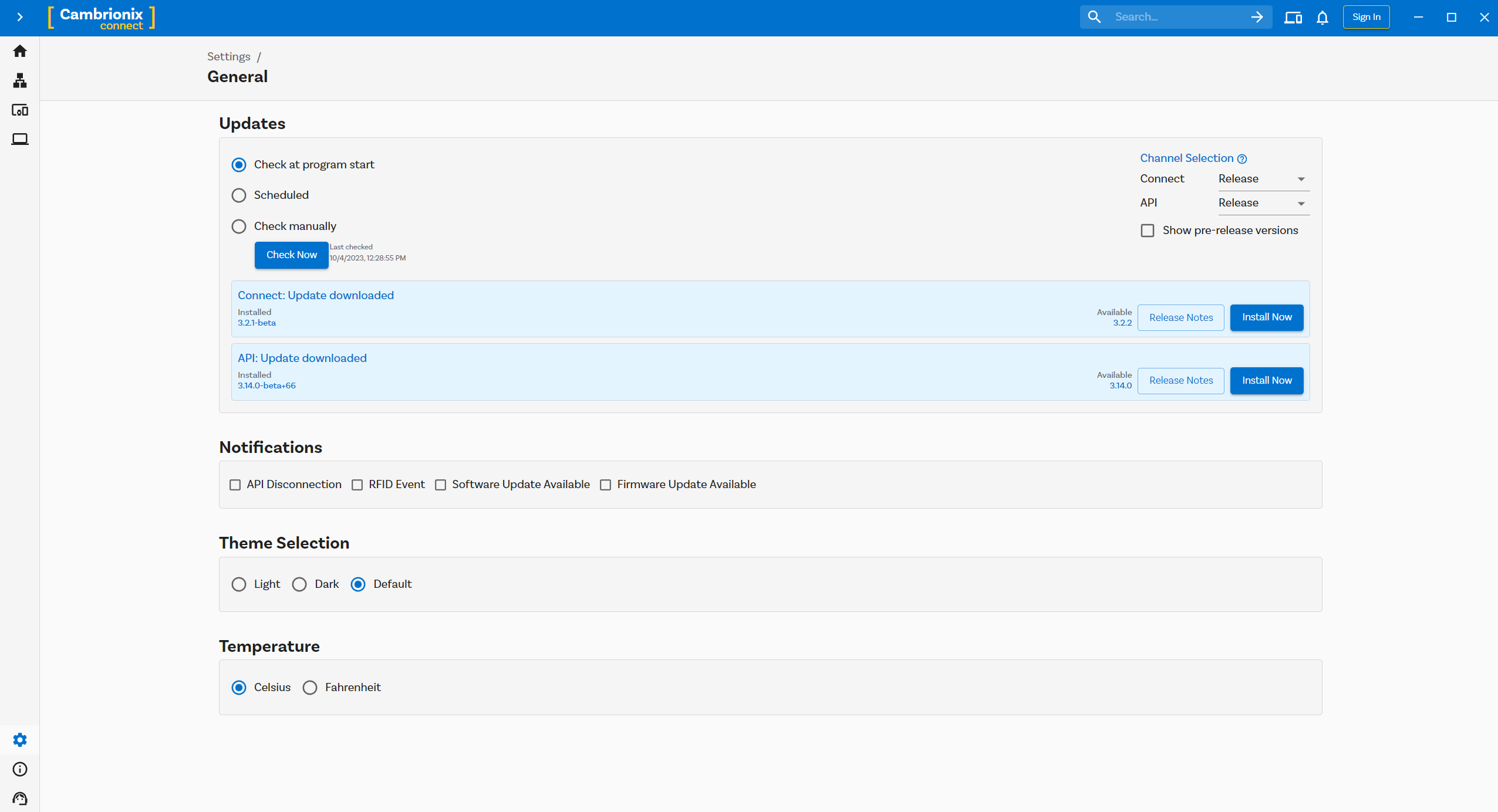 By going into the settings section on the left-hand side of Cambrionix Connect, you can navigate to the general tab, and under this can see the options for keeping both Cambrionix Connect and the API up to date.